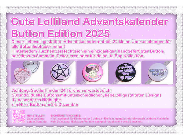 Der Cute Lolliland Button Adventskalender 2025 ist vollgepackt mit 24 einzigartigen, handgefertigten Buttons in liebevollen Designs. Von süß und verträumt bis frech und mystisch.